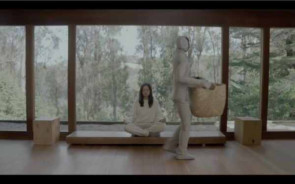 既然提到了「恐怖谷效应」,这里小雷还想展开讲一下人形机器人的设计:Neo Gamma是一款全人形机器人(区别于只有上半身的半人形),且1X科技依旧在非常克制的弱化其机器人属性: