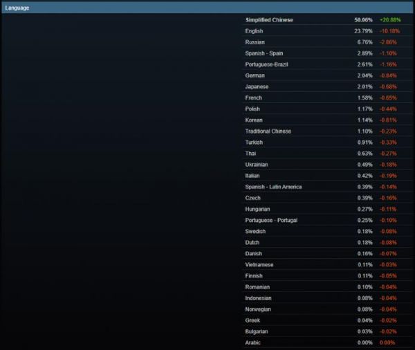 语言方面,使用中文的玩家数量骤增,增幅高达20.88%,使得中文玩家一跃成为Steam游戏平台上的最大用户群,占全体用户的50.06%。如果说游戏玩家是G胖的衣食父母,那么中文玩家必然是堪比亲生了。