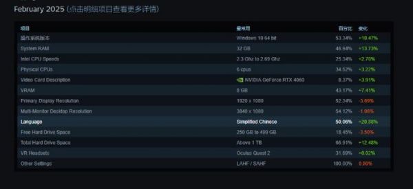 PC游戏平台Steam每个月都会对旗下用户的电脑硬件配置进行调查,日前发布了2025年2月的调查数据,数据结果亮点颇多,其中最引人注目的便是32GB内存成为主流,中文玩家成为最大用户群,而显卡市场依然死气沉沉。