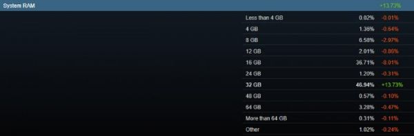 还在用16GB内存?Steam硬件调查表明,32GB内存已成主流
