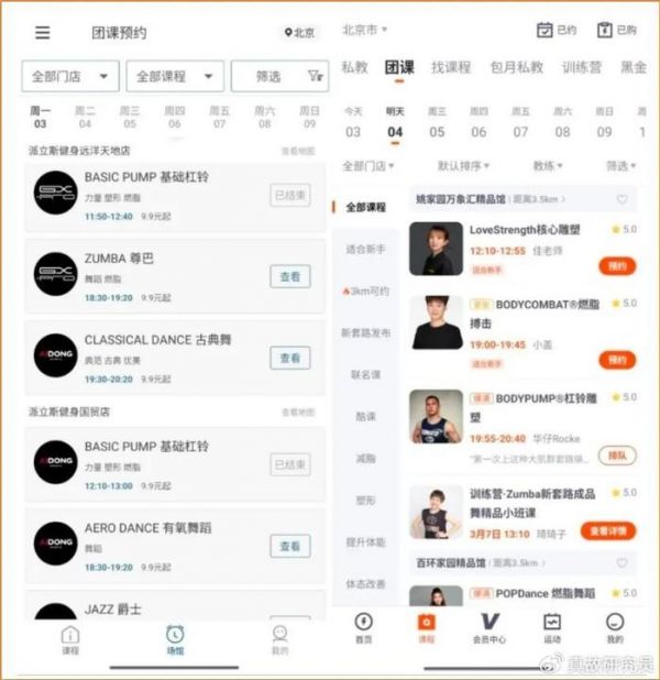 “爱动健身”是干嘛的?一张其与“乐刻健身”的界面对比图便可窥见端倪。这个爱动健身APP 与派立斯等多家健身场馆深度合作,提供课程预约和小团队课程预订服务,还利用大数据和人工智能技术分析用户健身数据,提供科学健身建议。