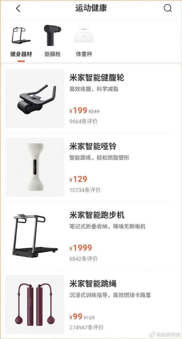 米家更是构建起丰富多元的健身产品体系:米家跑步机、动感单车等中型健身器械,米家智能跳绳、健腹轮、智能哑铃等小型健身器械,健身结束还有米家筋膜枪帮助舒缓肌肉酸痛。