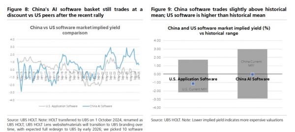 瑞银分析显示,中国AI软件的估值仍然远低于美国同行。与历史MIY(市场隐含收益率)范围相比,中国AI软件的交易价格略高于历史平均水平,这可能表明,考虑到增长前景的改善,估值仍有进一步上升的空间。