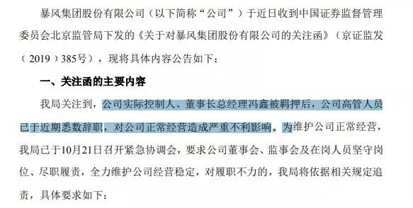 同日,暴风集团还发公告称收到北京证监局关注函。其中提到,公司实际控制人、董事长总经理冯鑫被羁押后,公司高管人员已于近期悉数辞职,对公司正常经营造成严重不利影响。北京证监局要求公司董事会、监事会及在岗人员坚守岗位、尽职履责,全力维护公司经营稳定,对履职不力的,将被追责。