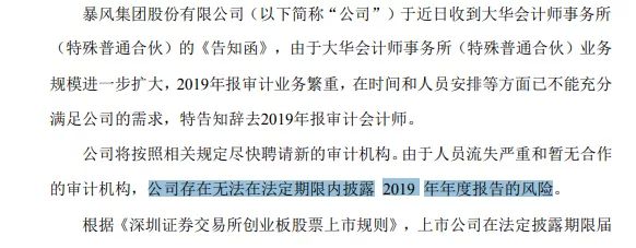 暴风集团称,大华会计师事务所在给出的《告知函》中提到,由于该所业务规模进一步扩大,2019年报审计业务繁重,在时间和人员安排等方面已不能充分满足公司的需求,特告知辞去2019年报审计会计师。
