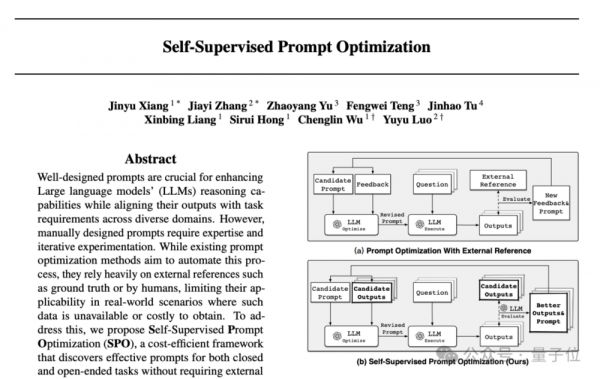 今年,以张佳钇和向劲宇为共同一作,五个人的名字共同出现在了一个名为SPO的项目当中,该项目能够让提示词自我进化,让人们摆脱研究提示词工程的繁琐过程。