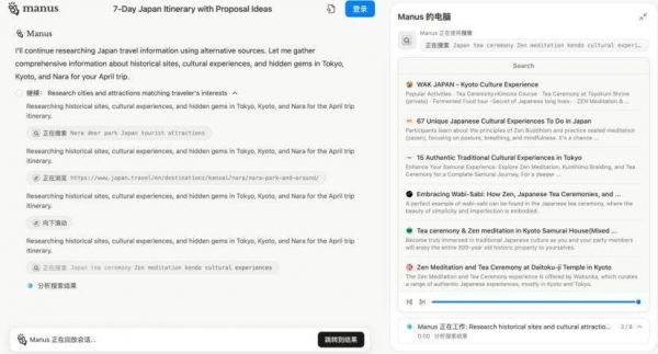打开Manus界面,有四部分构成,分别是浏览器、搜索、编辑器和终端。Manus自称“套壳”名副其实,跟AI搜索Perplexity一样,是把各类功能组合封装好的一款产品。