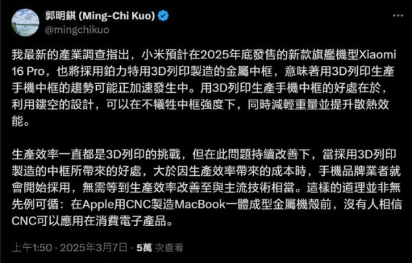 就在昨天(3 月 7 日),知名分析师郭明錤发布了他的最新产业调查结果,指出小米预计将在 2025 年底发布的小米 16 Pro 上,采用 3D 打印而成的金属中框。