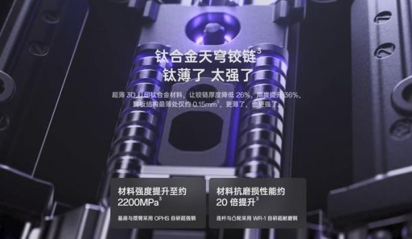 为了做到这一点,OPPO 选择将钛合金全面引入到铰链之中,这种材质的优势雷科技早在 2023 年的报道的中就曾提及,这里就不再赘述,大体就是兼顾了轻量和强度。但要在钛合金铰链的翼板上做到了难以置信的 0.15 毫米超薄厚度,这种精度几乎已经挑战传统 CNC 加工的极限。