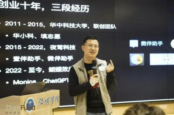 肖弘在华中科技大学分享创业经历。图片来自真格基金。