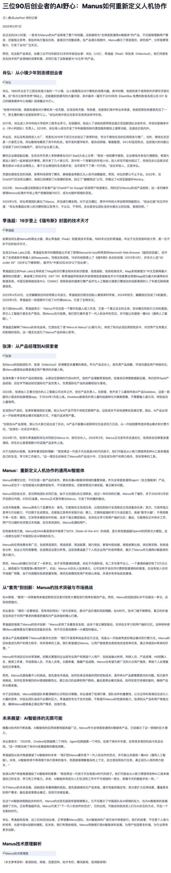 3 月 6 日,AI 产品 Manus 引发关注。开发 Manus 的三位关键人物是:创始人、CEO 肖弘(小红);联合创始人、首席科学家季逸超(Peak);以及产品合伙人张涛(hidecloud)——两位 90 后连续创业者和一位 15 年换了 10 家公司的 85 后产品老兵。