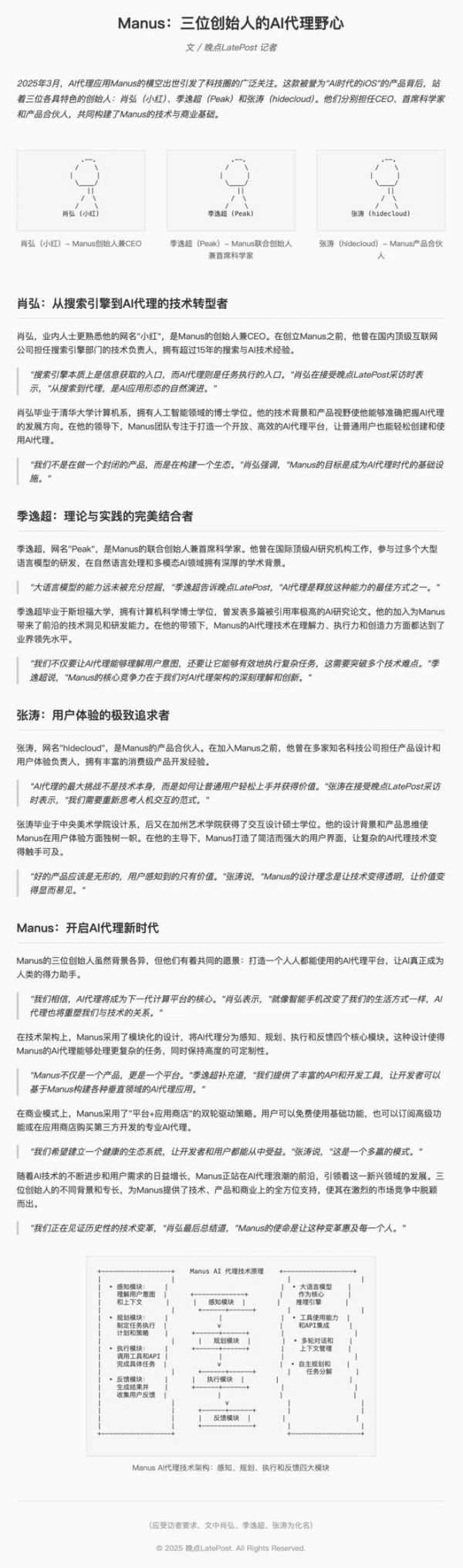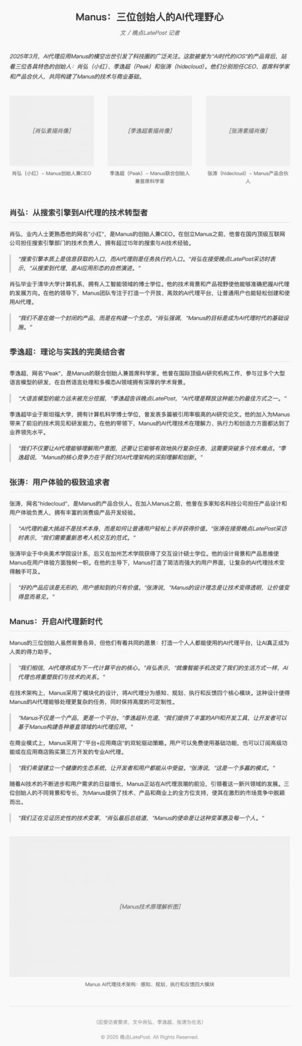 开发 Agent 应用 Manus 的有三位关键人物:创始人、CEO 肖弘(小红),联合创始人、首席科学家季逸超(Peak),产品合伙人张涛(hidecloud),请你帮我搜索他们的信息,用《晚点 LatePost》的风格撰写一篇稿件介绍他们,然后把文章做成一个网页,用他们的照片当作插图,照片要处理成华尔街日报专栏配图风格的素描图。在文章的末尾,请你附上向普通人解释 Manus 技术原理的解析图。