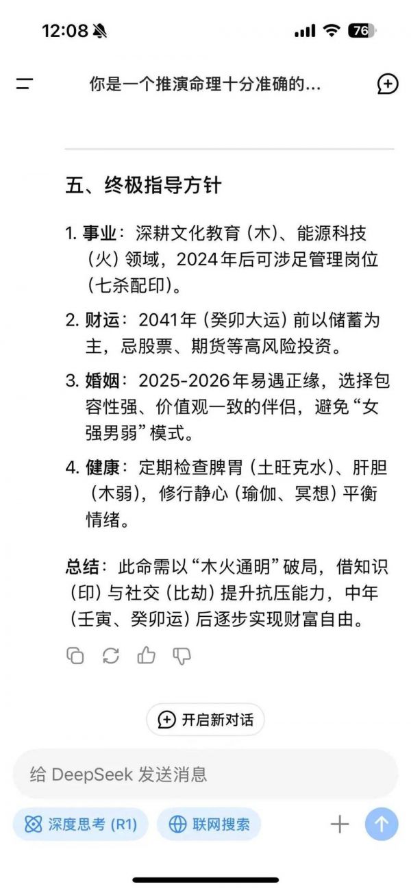 很快,她就发现DeepSeek输出的结果会出现明显的低级错误,有次甚至排错了她的“四柱八字”(中国传统命理学中人的生辰信息,四柱即年柱、月柱、日柱、时柱,以天干地支表示,每柱有两个字,加起来即为生辰八字)。