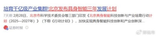 北京发布具身智能三年发展计划,力争量产总规模率先突破万台,培育千亿级产业集群。