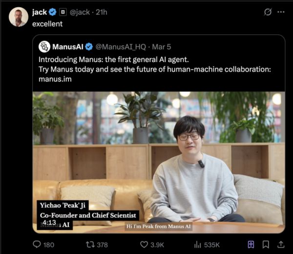 Twitter 的创始人杰克·多尔西也转发了 Manus AI 官方 X 上的视频并简短地表达了夸赞:
