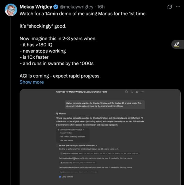 对于 AI 领域的开发者而言,这是他们长期追寻的目标——一个不仅能生成信息,还能理解、应用,并在错误中学习的系统。而对于依赖 Manus 执行任务的人来说,这种变革可能意味着深刻的冲击。