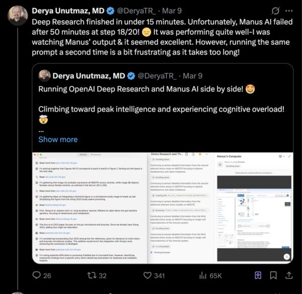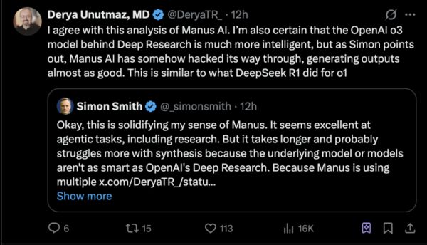 以及,“Deep Research 背后的 OpenAI o3 模型要更智能得多,但正如 Simon 指出的那样,Manus AI 不知怎么另辟蹊径,生成的输出结果几乎同样出色。这有点类似于 DeepSeek R1 对 o1 所做的事。”
