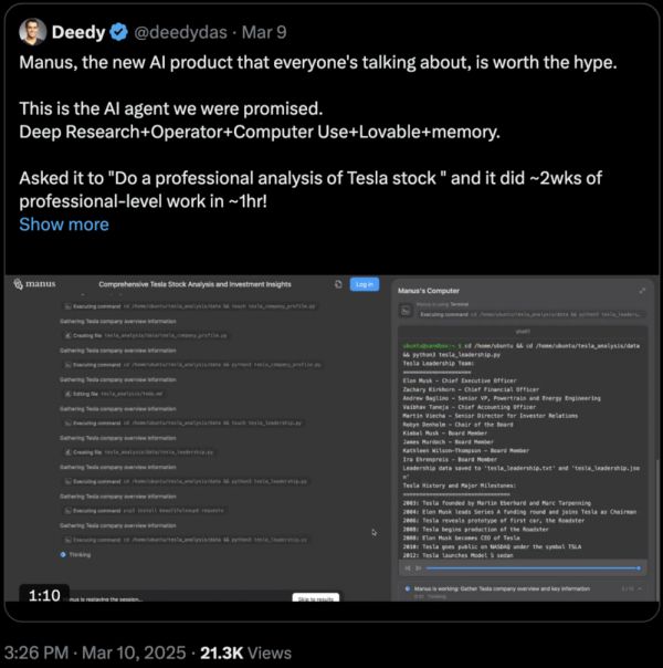 MenloVentures 的 VC Deedy 用 Manus 对特斯拉股票做了一份专业分析,后者仅用大约 1 小时就完成了大约 2 周专业水平的工作: