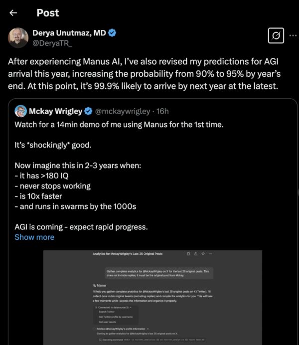 最近的一条关于 Manus 的更新里,他还修改了对 AGI 的预测,将年底前出现的概率从 90% 提高到 95%。“最迟到明年到来的可能性为 99.9%。”