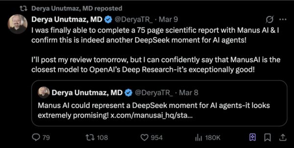 AI 政策研究员 Dean Ball 将 Manus 描述为“使用 AI 的最复杂的计算机”,甚至给到比 deepseek 更高的评价,“Deepseek 是关于复制美国公司已经公开实现的能力,Manus 是在推进前沿研究”。