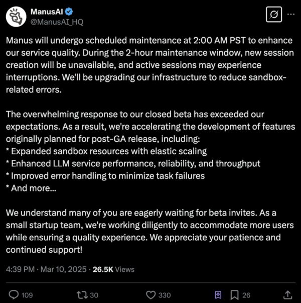 Manus AI 在 X 上宣布将在太平洋时间凌晨 2:00 进行定期维护|图片来源:X