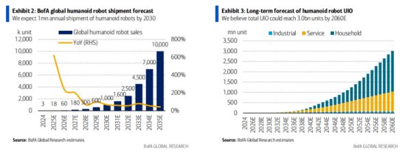 研报预测,2025年全球人形机器人出货量将达到1.8万台。到2030年和2035年,全球人形机器人年出货量预计将分别达到100万台(此前预测为40万台)和1000万台,这相当于2025年至2035年的复合年增长率为88%。美银对人形机器人的长期需求持乐观态度,因为它们开始在家用和服务应用中得到大规模采用。