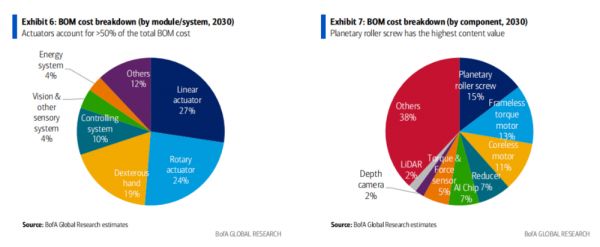美银还对人形机器人的零部件成本结构进行了详细分析。预计到2030年,执行器(actuators)将占据总物料成本的50%以上,其次是灵巧手(dexterous hand)和视觉及其他传感系统。