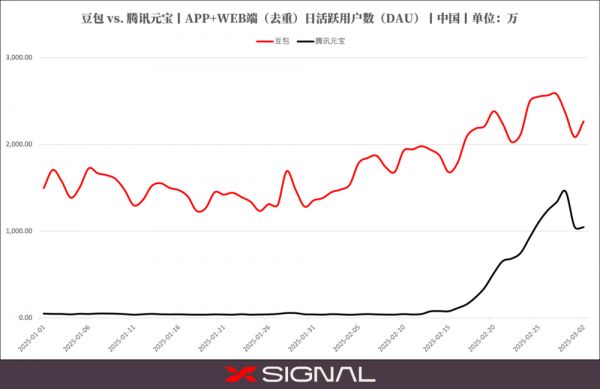 与之相对应的是元宝的DAU走势。据Xsignal,从2月17日一直到2月末,元宝DAU呈直线攀升的态势。而2月17日,也正是元宝开始发力的时间点。