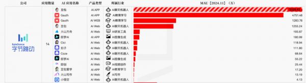 字节跳动核心AI应用MAU排名,图源:Xsignal