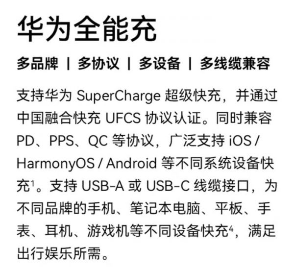 (图片来源:华为官方)其实这也不能全怪手机厂商不上心,因为UFCS融合快充协议本来就存在很多小问题。第一便是功率,第一版的UFCS最高功率仅有44W,但不少网友实测只有30W上下。这个功率在手机厂商自家的120W、200W和240W面前完全不够看,这种自毁优势的事情,手机厂商自然不愿意干。
