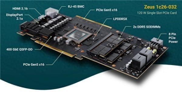 这款显卡采用模块化设计,支持LPDDR5X内存和2个DDR5 SODIMM插槽,可将显存扩展至384GB。Zeus显卡还创新性地设计了RJ-45网线接口和两侧的PCI-E 5.0 x16金手指接口,这在消费级显卡中尚属首次。