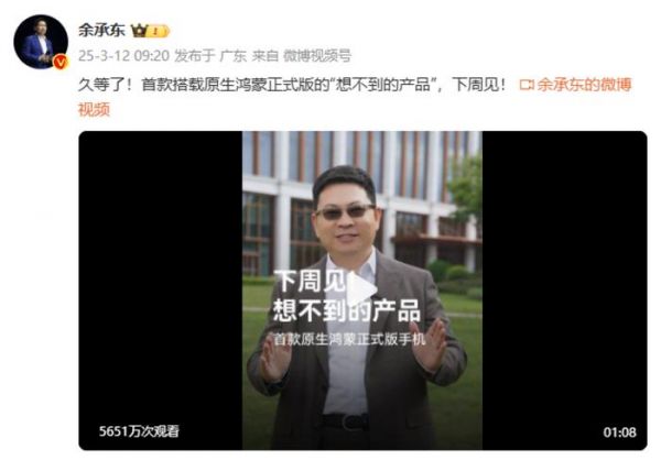 现在余承东终于官宣了,他在一段预热视频中明确提到,首款搭载原生鸿蒙正式版操作系统的手机将于下周发布,这款产品也将标志着华为终端全面迈入“纯血鸿蒙”时代。