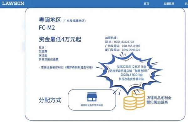 加盟信息显示,在粤闽地区(广东、福建)的罗森小站,加盟费最低 4 万元起,包含 1 万元加盟费、2 万元保证金和 1 万元氛围改造费。只要店铺面积在 20 平米以上,就符合开店规定,合同年限为 3 年。如果加盟商在 2025 年内更换罗森小站招牌,则 " 加盟费 0 元 ";如果在 6 月 30 日前完成,连氛围改造费也免了。
