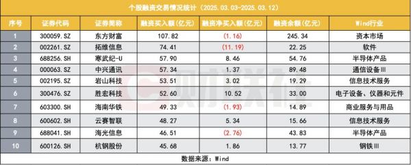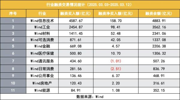 从行业融资数据看,科技与先进制造板块占据绝对主导地位。2025年3月3日至12日,信息技术、工业、材料三大行业分别以4587.67亿元、2454.87亿元、1411.45亿元的融资买入额位列前三,合计占期间全市场融资买入额(12684亿)的66.75%。其中,信息技术行业融资净买入额达158.7亿元,远超其他行业。
