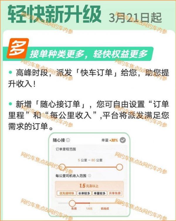 网约车内参讯(文/彭小伟)3月14日,无锡滴滴司机爆料:3月21日起当地轻快司机权益升级,既可以在高峰时段接快车单,还新增了随心接订单,可以自由设置“订单里程”和“每公里收入”。
