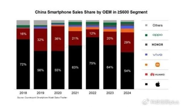 上一个数据,比如能够明显的证明,那就是600美元以上高端市场的份额,我们可以看到苹果在持续下滑,从2022年的75%降至2024年的54%了,跌了四分之一多。