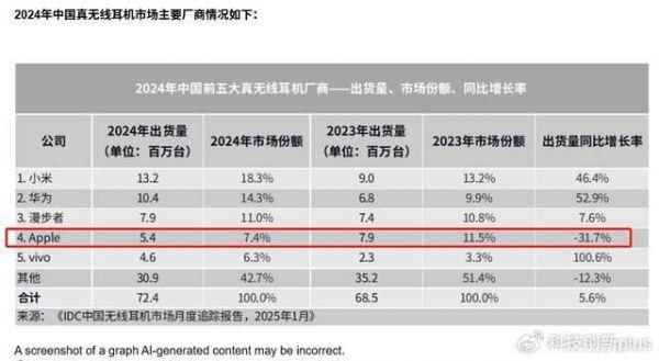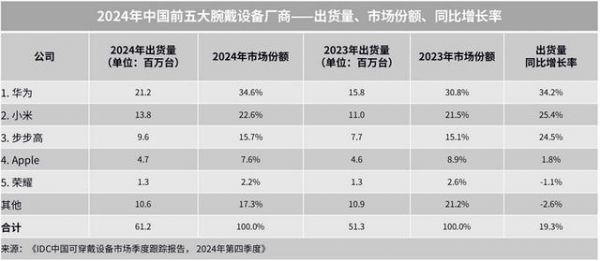 最后再看看watch,也就是智能手表这一块,同样上数据,这下IDC统计的2024年腕戴设备的市场情况,可以看到苹果已经跌至第4名了。
