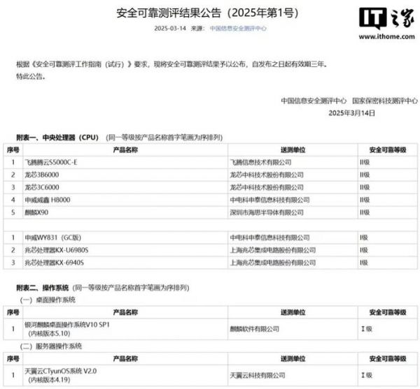 近日,中国信息安全评测中心发布了一份安全可靠测评结果公告(2025 年第1号),曝光了麒麟X90处理器。