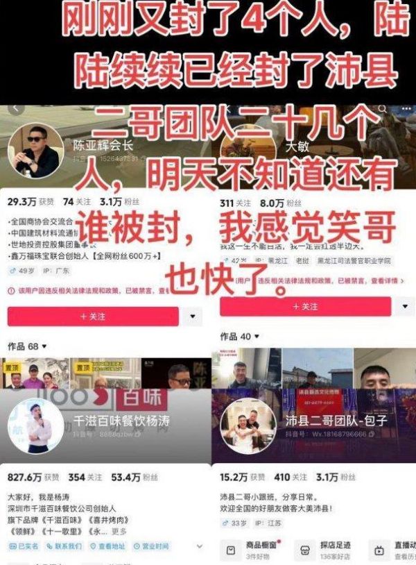 平台开启第二轮严打,5位网红一起被封杀,不尽快转型就等着被封,近期,网络平台对炫富网红的打击力度持续加大。继顾茜茜炫耀自己“一天什么都不干也能赚30万”后被平台封禁,“沛县二哥”及其团队内的其他四位网红也因频繁发布炫富视频而被封号,这一系列行动表明,平台正对炫富行为进行新一轮的清理。