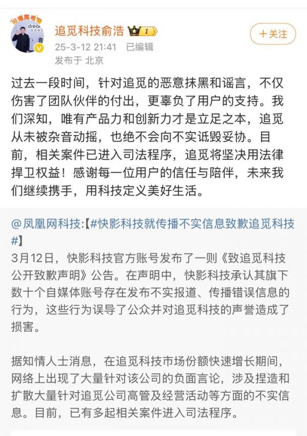 3月12日,追觅科技创始人俞浩,在官方微博转发了一条“山东快影科技”的致歉声明。