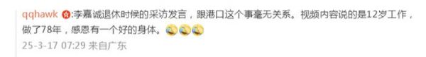这不,其中一位网名为“qqhawk”的网友(地址为广东,能听得懂李嘉诚说了什么),在上述视频下的评论,道出了真相:李嘉诚退休时候的采访发言,跟港口这个事毫无关系。视频内容说的是12岁工作,做了78年,感恩有一个好的身体。