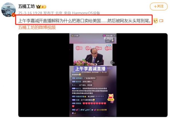 一位粉丝不到100万的军事博主(自媒体)于昨天(3月16日)晚间时间发布了一段41秒的视频,并配文称:“上午李嘉诚开直播解释为什么把港口卖给美国……然后被网友从头骂到尾。”