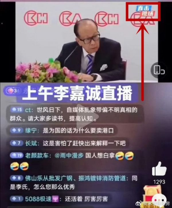 即便你听不懂“上述所谓的直播”中李嘉诚说了什么(他讲的不是普通话),仅仅从视频右上角的水印“直击现场”字样来看,以及镜头与李嘉诚的位置和角度等细节,也能大致看出来,更有可能是现场媒体记者或其他拍摄人员做的直播。