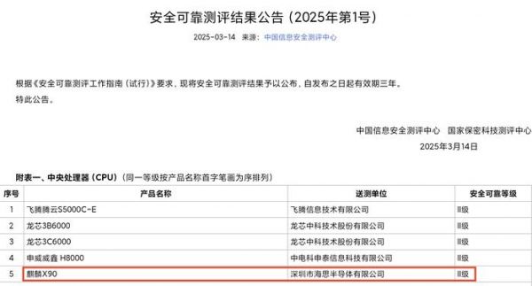 在这一领域,华为已经做出了深度布局,中国信息安全评测中心发布的一份安全可靠评测报告中,就展示了华为海思的全新处理器麒麟X90。