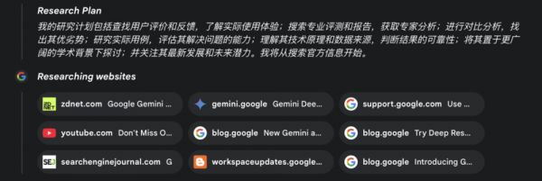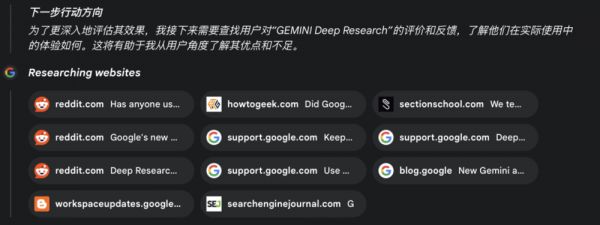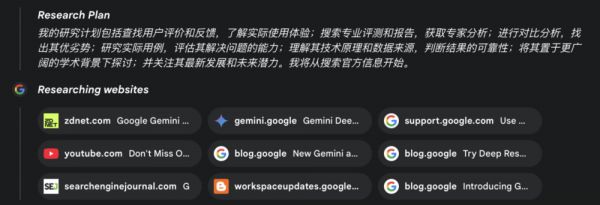 第五条,它会找一些和 Gemini Deep Research 类似的工具,做一个对比,看看它在竞争中有什么优势或者不足;第六条,研究一些实际使用过的案例,看看这个工具在解决实际问题时表现如何。