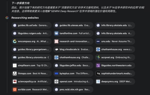 我注意到,它对学术研究特别感兴趣,它搜了27个学术网站,想找些和深度研究有关的文献,还有AI在学术界的应用信息。