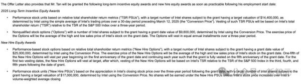 1440万美元的股票单位+1700万美元绩效股:两项奖励都将在五年内兑现。若英特尔股价在未来3年内下跌,将不会获得任何股票;如果公司股价表现优于市场,还将获得更多股票。