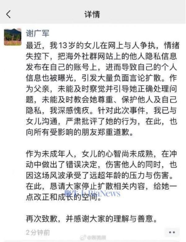谢广军表示:“我13岁的女儿在网上与人争执,情绪失控下,把海外社群网站上的他人隐私信息发布在自己的账号上,进而导致自己的个人信息也被曝光,引发大量负面言论扩散。作为父亲,未能及时察觉并引导她正确处理问题,未能及时教会她尊重、保护他人及自己隐私,深感愧疚,向所有受影响的朋友郑重道歉。”