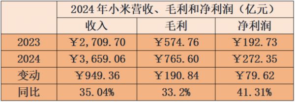 2024全年,小米营收3659.06亿元,同比增长35.04%;毛利润765.6亿元,同比增长33.2%;经调整净利润同比增长41.31%至272.35亿元。
