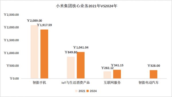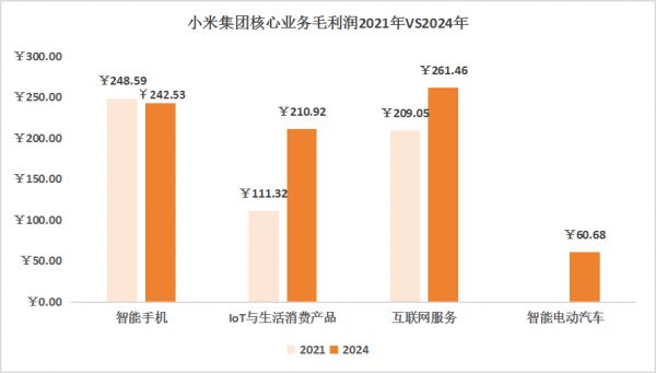 从整体收入情况来看,剔除掉造车收入后2024年营收为3331.06亿元,较2021年仅增长了1.46%;剔除掉造车的毛利润,则相比2021年增长了20.99%。其中手机业务在高端路径中“以价换量”反而拖累整体,而IoT相关产品和由硬件基数支撑的互联网服务真正意义上为小米带来重生。
